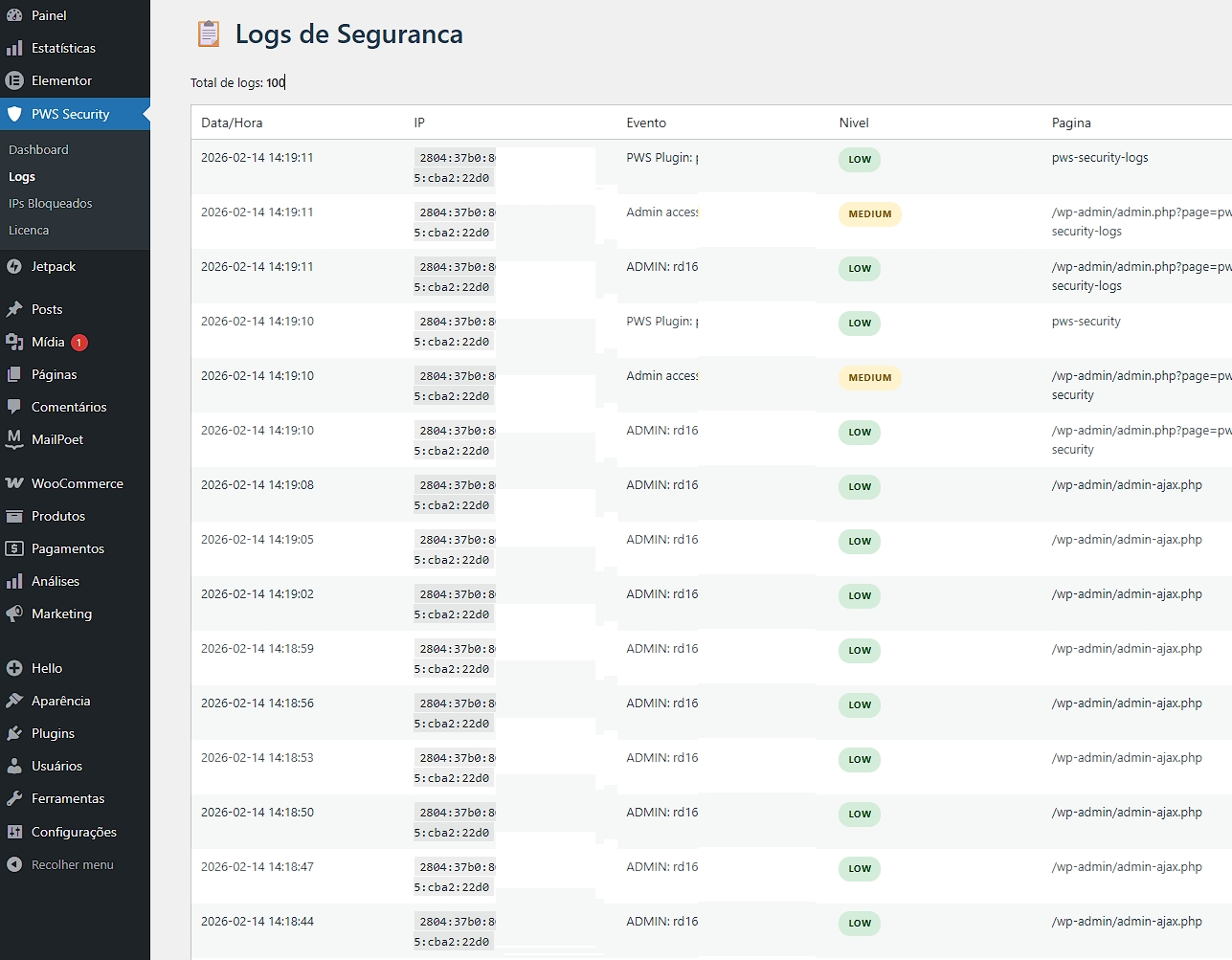 Registra atividades suspeitas com data, IP, ação executada e nível de ameaça.
